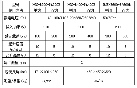 PA600B微型電動葫蘆技術(shù)參數(shù)表: