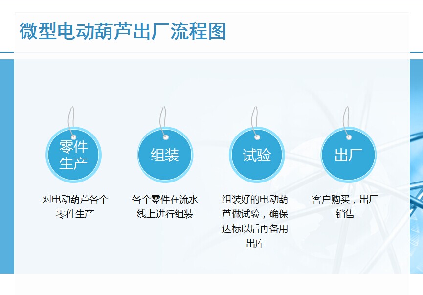 ?近期一些的用戶向我們做反饋,想要知道一些關于微型電動葫蘆方面的知識,更貼近的了解它的情況,今天我們就對電動葫蘆的出廠流程做解密,為了便于用戶了解,我們將以圖片的形式給大家做展現。